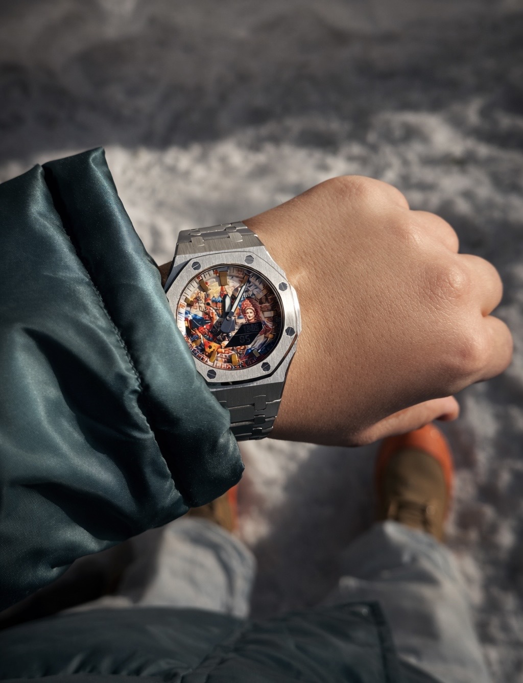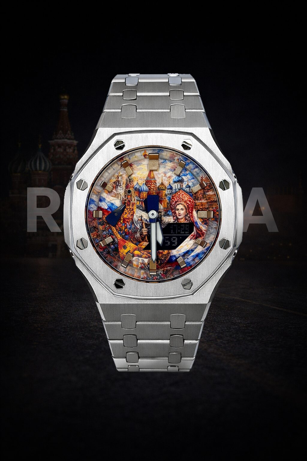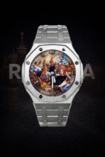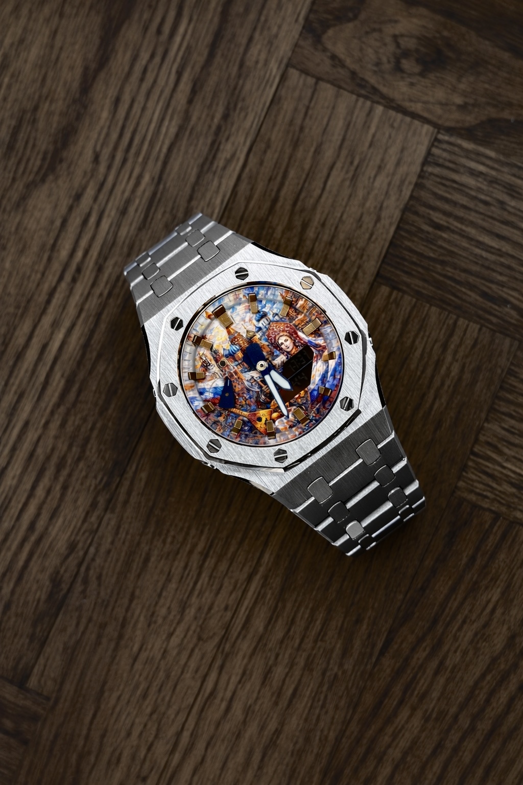 Стальной корпус выступает в роли рамы, сдержанной и благородной, позволяющей сосредоточить взгляд на композиции внутри. Контраст холодного металла и насыщенной живописной сцены создаёт ощущение предмета, существующего вне текущего времени.