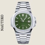 Наши кастомные Seiko Mod в стиле Nautilus в серой стали с зеленым циферблатом – это дань уважения культовой модели. Каждые часы собираются с высокой точностью с использованием оригинального механизма Seiko.